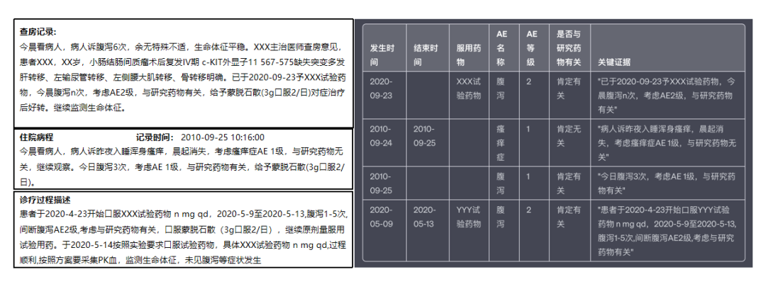 彭滔表示,经过“教育”的大模型已经可以在知识检索查询、医疗过程中不良事件的提取和判断等医疗场景中进行应用。举例来说,在药物或医疗器械研发中,安全性是基本要求。因此,对于不良事件的提取和评估至关重要,需要从临床病例中提取信息,例如事件发生时间、结束时间、具体使用的药物、事件的严重程度以及与研究药物的关联性等,大模型技术在这个过程中展现出了强大的理解、特征提取和推理能力。(如下图所示)