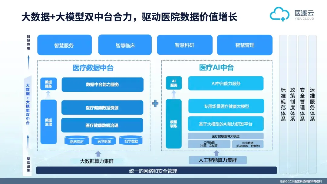“医渡垂域大模型一站式解决方案”通过构建“数据中台”与“AI中台”的双中台协同体系,为医疗机构赋予了自主创新的能力,有效驱动了医院数据价值的增长。依托大模型技术,新一代数据中心EYWA实现了跨系统、跨业务、跨院区、跨中心的一体化升级,以高标准满足了多元化用户群体的各类应用需求。此外,医渡云智慧大科研体系在大数据和大模型的双重赋能下,形成了从科研数据治理到产品体系,再到服务体系的完整解决方案,显著提高医生的临床科研效率,助力医院重点学科的蓬勃发展,并加速科研成果的临床转化。在大模型技术的加持下,医渡云还成功融合了多项前沿技术与平台,为健康医疗数据的全生命周期管理、安全使用,以及在全民健康、监管服务、个人健康管理等多场景中的深度应用开辟了道路。