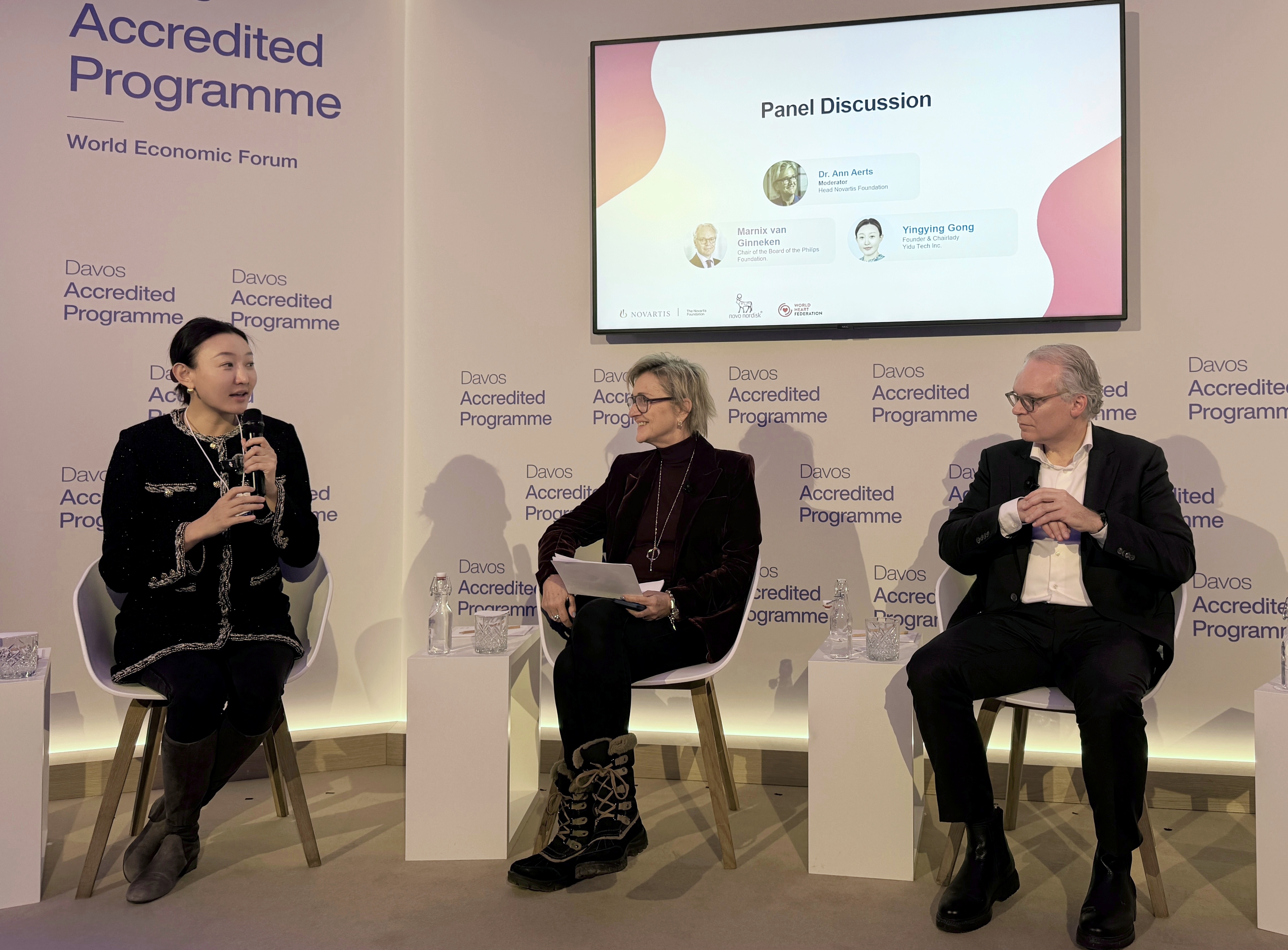 在由诺华基金会、诺和诺德及世界心脏病联盟共同举办的“通过合作与人工智能扩大社会影响力创新”达沃斯论坛主题会议上,医渡科技创始人、董事长宫如璟与飞利浦基金会董事会主席Marnix van Ginneken围绕数字健康与公共卫生体系创新展开对话,诺华基金会负责人 Ann Aerts博士担任主持人。