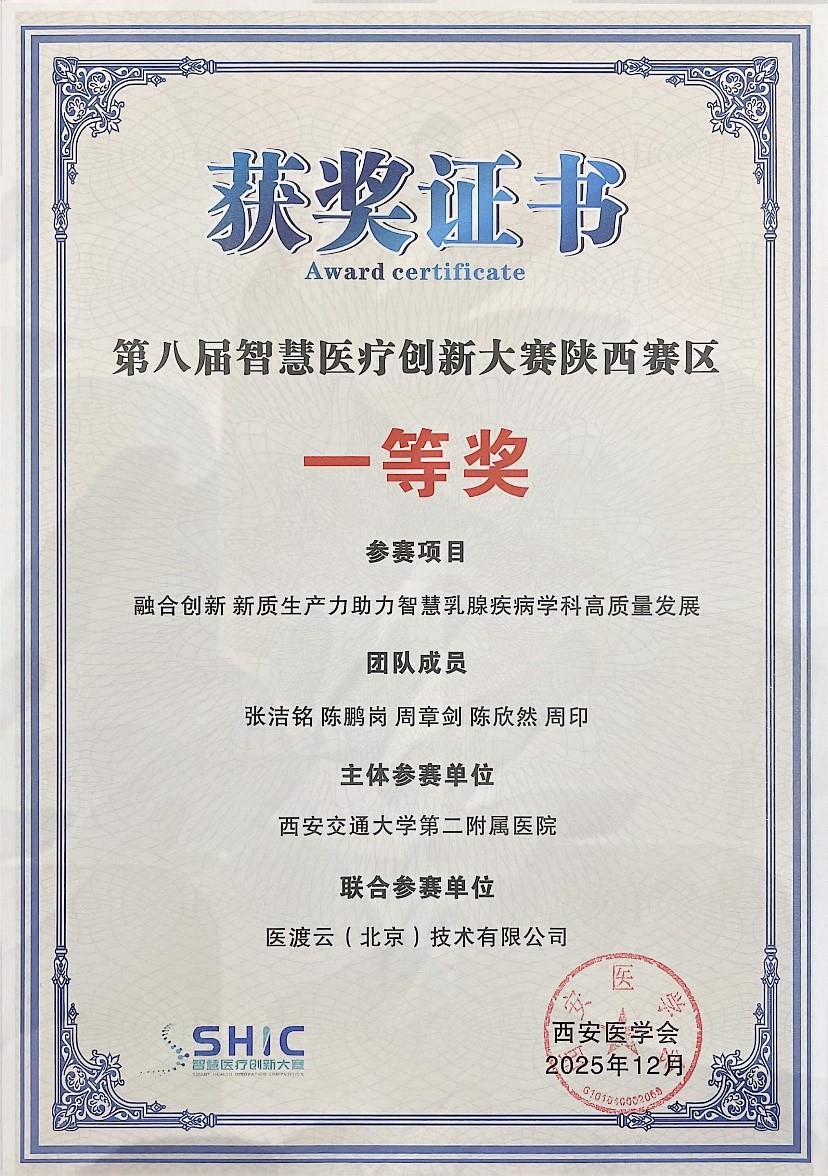 近日,国内AI医疗领域头部企业医渡科技(02158.HK)与西安交通大学第二附属医院(西北医院)联合申报的 “融合创新 新质生产力助力智慧乳腺疾病学科高质量发展”项目,荣获第八届智慧医疗创新大赛陕西赛区一等奖。