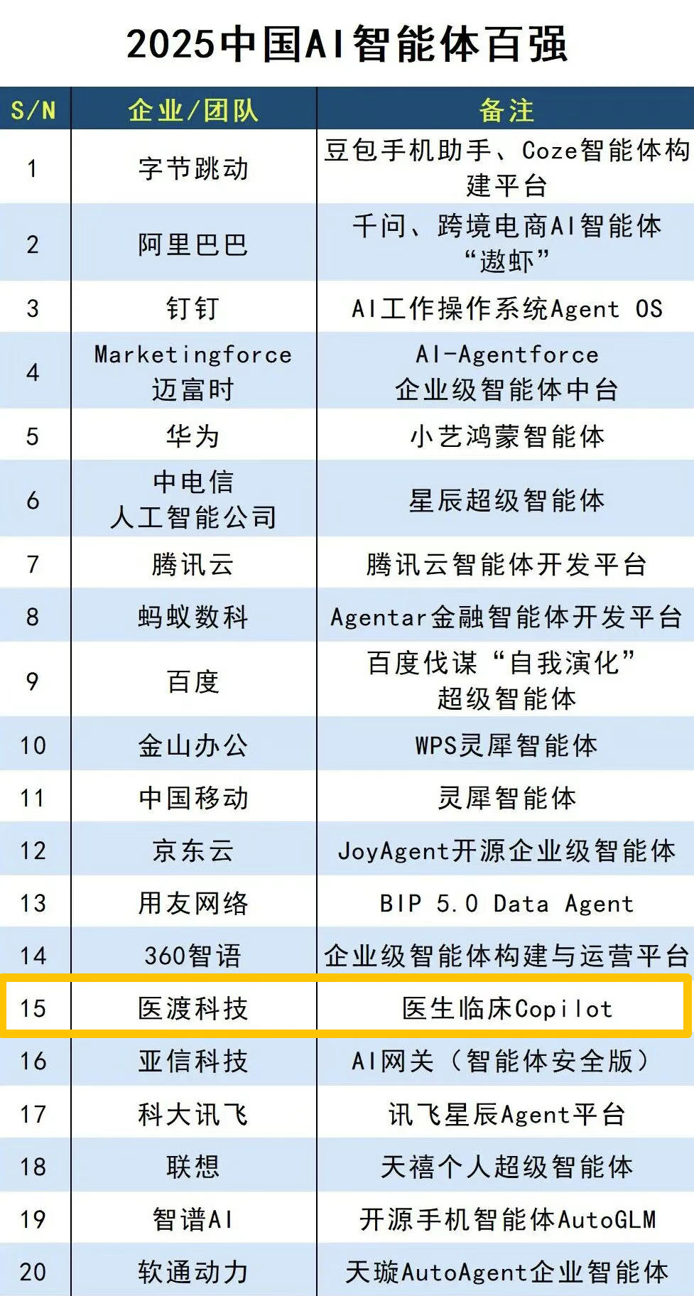 近日,中国科学院《互联网周刊》、德本咨询和eNet研究院联合发布“2025中国AI智能体百强榜”。医渡科技自主研发的“医生临床Copilot”凭借其在医疗场景的技术创新与落地成效荣登该榜单,且位居医疗领域第一。